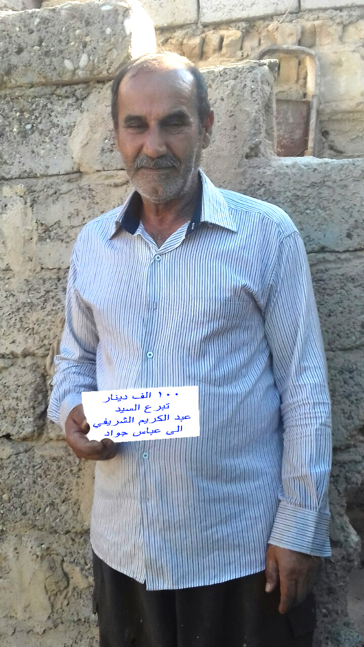 بتاريخ 14/6/2018 تبرع السيد/ عبد الكريم الشريفي مبلغاً وقدره (100) الف دينار عراقي للمريض (عباس جواد) وقد تم تسليم المبلغ للمريض وهو يدعوا الله تعالى قبول اعماله ، ادارة فرع الكريعات تقدمت بالشكر الجزيل للمتبرع ودعت الله تعالى قبول الاعمال والله الموفق.