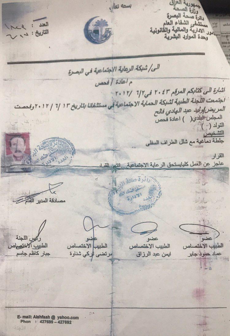 - كفالة طبيه بمبلغ (50) الف دينار عراقي شهرياً لزوجها العاجز .