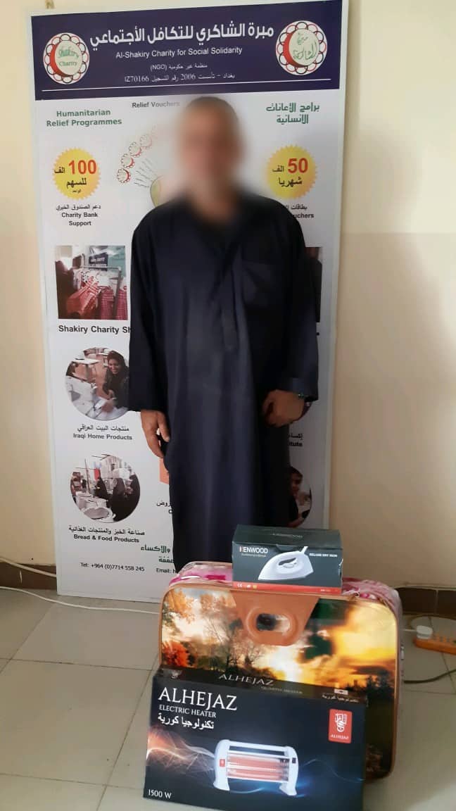 المتعفف(عبد الزهرة ناصر خشين ) يحصل على تبرع بقيمة (50) الف دينار مساعده من الساده المتبرعين في لندن لاختيار ما يلزمه وفق نظام بطاقات الغذاء والاكساء من محلات الشاكري الخيرية حيث تم تجهيزه حسب طلبه ببطانية ومدفأة كهربائية ومكواة وقد تم تسليم المساعدة لها بعد ان تم الاتصال عليه وحضر الى الفرع