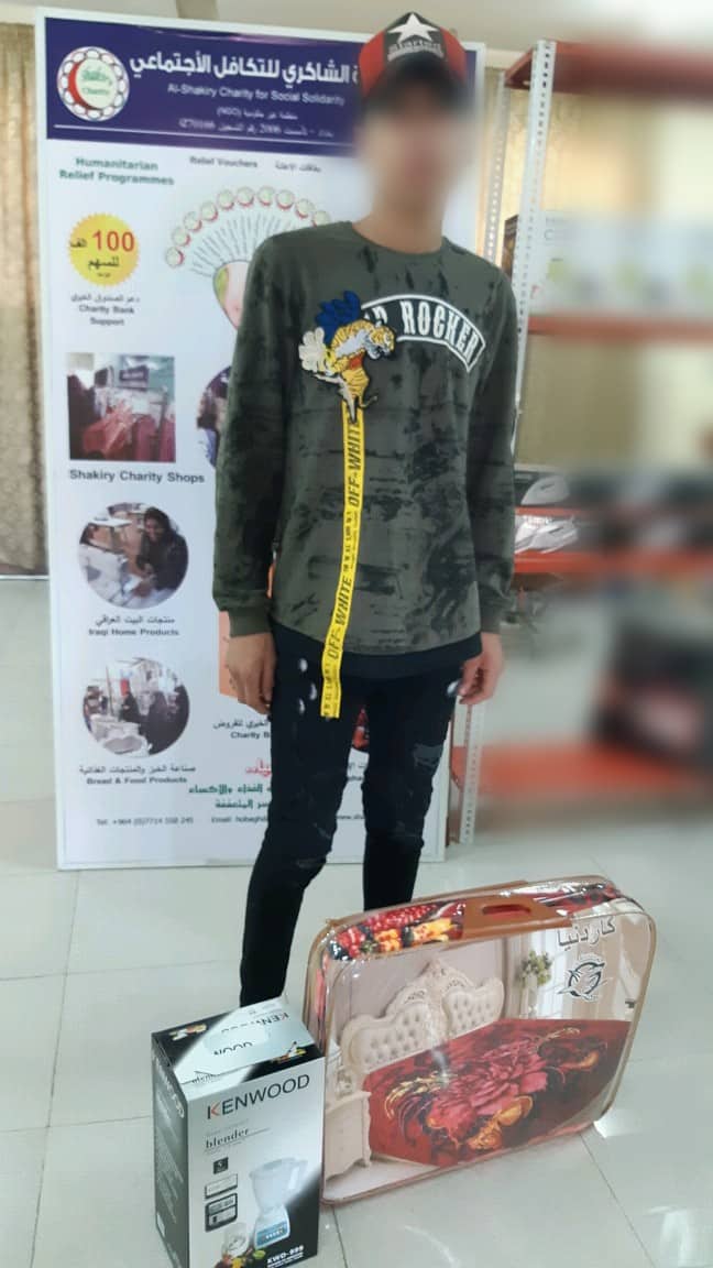 السيدة( ابتسام . ق . س ) تحصل على تبرع بقيمة (50) الف دينار مساعده من الساده المتبرعين في لندن حيث تم تجهيز الارملة من محلات الشاكري الخيرية بنظام بطاقات الاعانة والاكساء وحسب طلبها ببطانية وخلاط كهربائي وقد تم تسليم المساعدة الى الابن بعد ان تم الاتصال عليهم وحضر الى الفرع