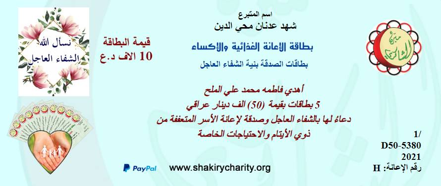 قام كادر فرعنا بتسليم المساعدة النقدية الواردة من المتبرعة الكريمة السيدة / شهد عدنان والبالغ مقدارها ( 50) الف دينار عراقي لأسرة المتعفف( حميد.ش.ظ ) وذلك صدقه عن السيدة ( فاطمه محمد علي الملح ) بنية الشفاء العاجل لها ان شاء الله.