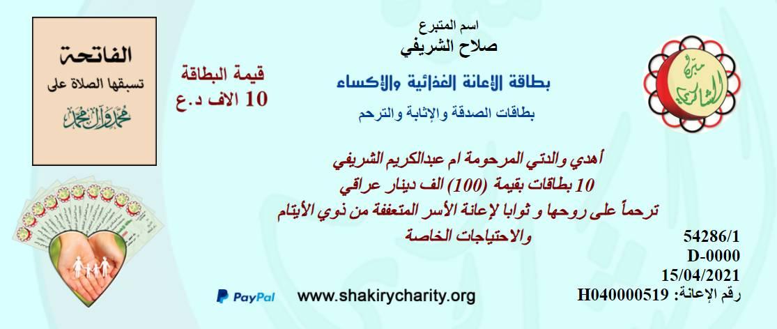 وقيمة (10) بطاقات ايضا على روح المغفور لها والدته (ام عبدالكريم الشريفي) ثوابا وترحما على روحها الطاهرة .