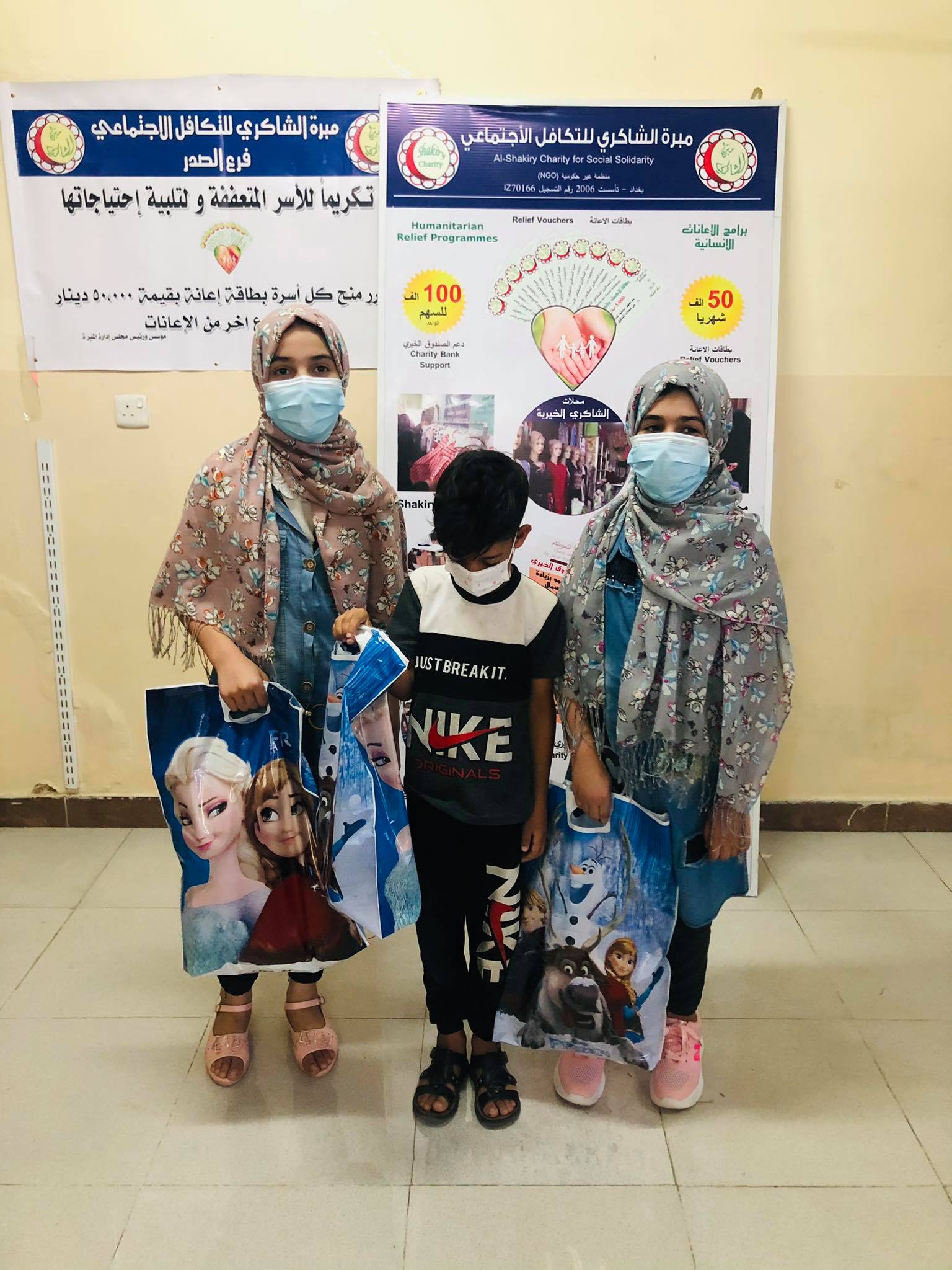 حيث تم تقسيم البطاقات على (20) اسرة حصة الاسرة الواحدة (50) الف دينار عراقي ، وتم تجهيز الاسر بسلة غذائية وبكسوة العيد للاطفال من محلات الشاكري الخيرية .