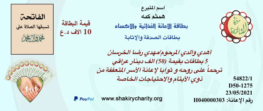 تبرع السيد / هيثم كبة بقيمة خمس بطاقات اثابة وترحم على روح المرحوم المغفور له والده /مهدي رضا الخرسان ثوابا وترحما على روحه الطاهرة .