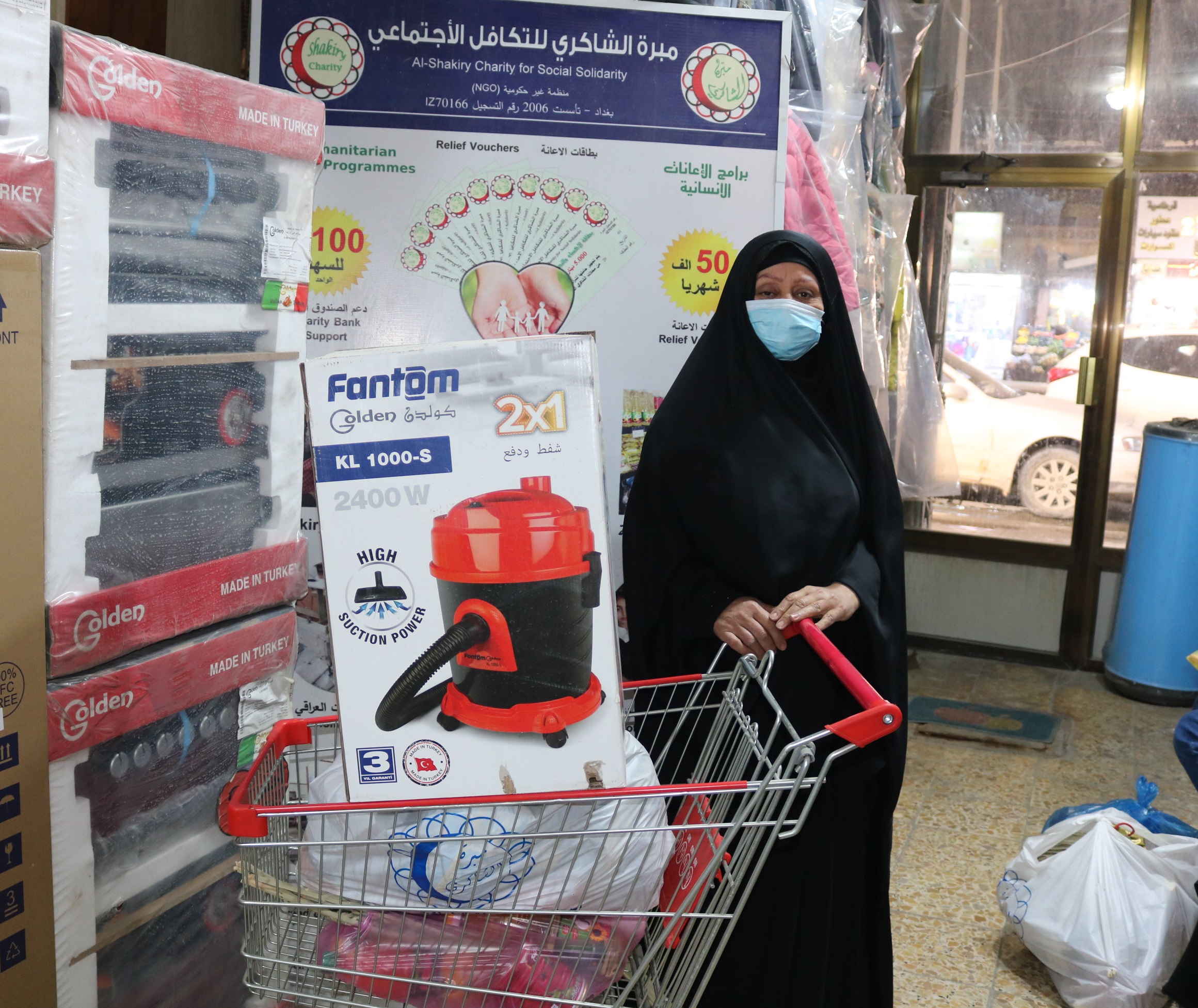 وبعد الاستلام ابدت الارملة حاجتها الى مواد غذائية ومكنسة كهربائية من محلات الشاكري الخيرية.