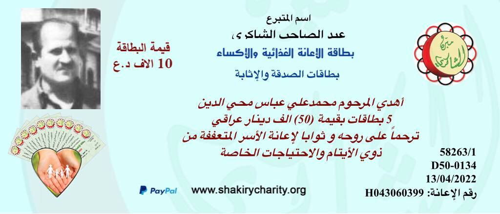 وجاء هذا التبرع من خلال اهداء الاستاذ/عبدالصاحب الشاكري خمس بطاقات اثابة الى روح المرحوم (محمد علي عباس محي الدين ) ثوابا وترحما على روحه الطاهرة .
