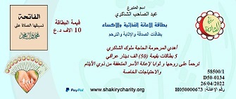 قيمة هذه البطاقات ( 50 ) الف د.ع مقدمة من قبل الحاج / عبد الصاحب الشاكري لأعانة اسرتها وابدت السيده رغبتها في شراء ( سله غذائيه رمضانيه ) تم توفيره للمستفيده عن طريق محلات الشاكري الخيرية .