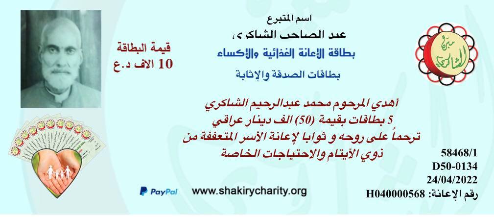 الاستاذ /عبدالصاحب الشاكري يهدي خمس بطاقات اثابة وترحم لروح المرحوم (محمد عبدالرحيم الشاكري) ثوابا وترحما على روحه الطاهرة .
