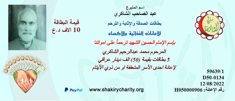 وقد تم تأمين التبرع من قبل الحاج / عبد الصاحب الشاكري ببطاقة الصدقة والاثابة والترحم والبالغ قيمتها (50)الف.د.ع لصالح اسره المتعففه / امل . س . ع ثواباً وترحماً لروح المرحوم والده الحاج / ( محمد عبد الرحيم الشاكري ) بثواب الامام الحسين (ع) .