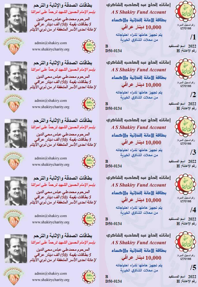 تبرع الاستاذ / عبدالصاحب الشاكري بخمس بطاقات صدقة واثابة ، ثوابا وترحما لروح المرحوم (محمد علي عباس محي الدين ) بأسم الامام الحسين الشهيد عليه السلام .