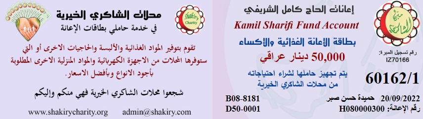 يقدم كادرنا واسرة المتعففه بالشكر والامتنان للمتبرع الكريم داعين المولى عز وجل ان يوفقه لفعل الخير .