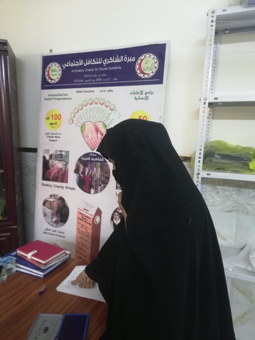 وفق بطاقات الغذاء والاكساء , وبعدها ابدت هذه الارملة رغبتها بالحصول على ( سلة غذائية ) , وتم توفيرها لها