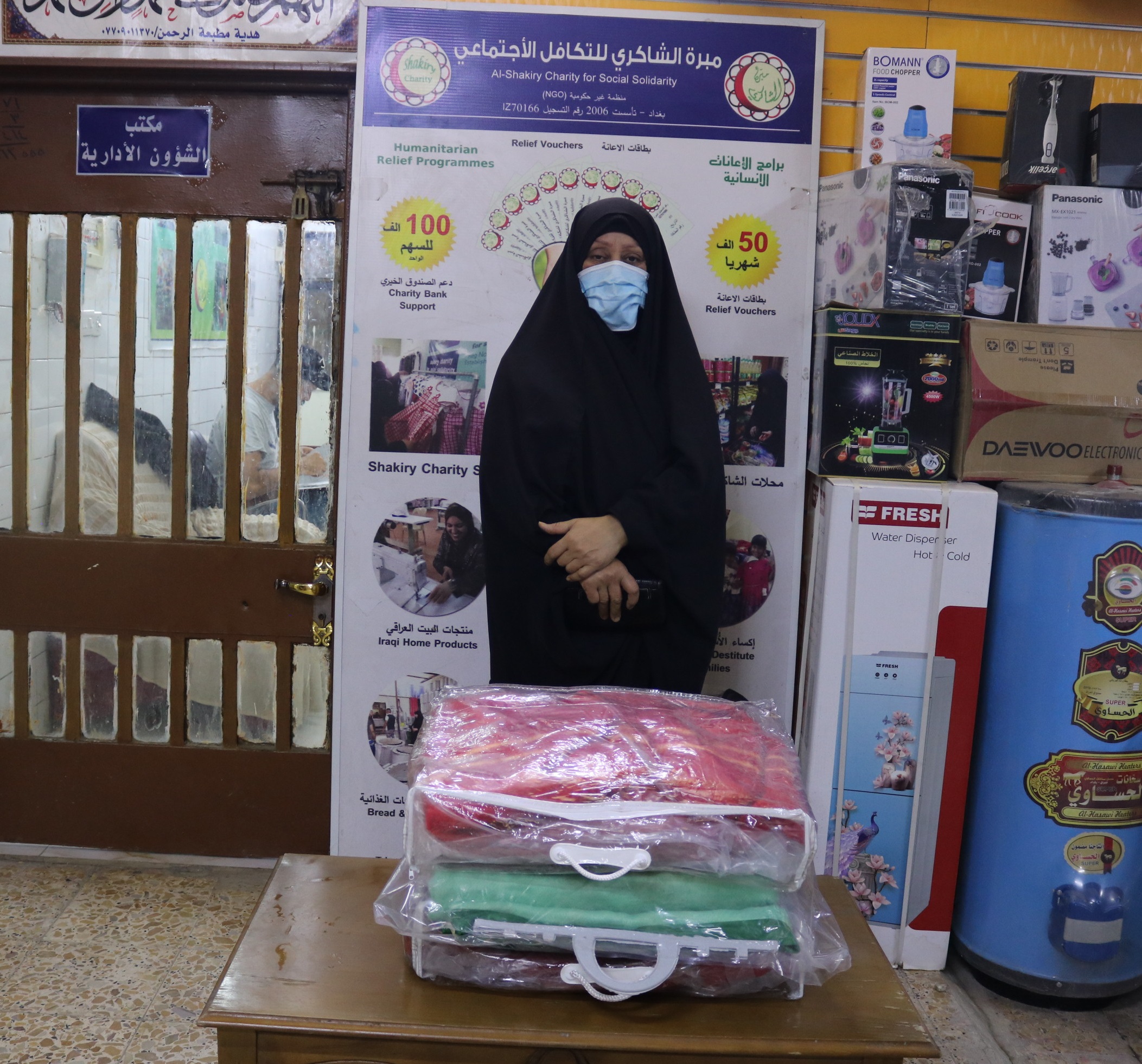 بعد الاستلام ابدت الارملة رغبتها بالحصول على ( بطانيات ) تم تجهيزها من محلات الشاكري الخيرية .