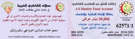 تبرع الحاج / عبد الصاحب الشاكري بمبلغ وقدره (50) الف دينار عراقي عن قيمه بطاقه غذاءواكساء لصالح الارمله / ايمان . ه . س لتقوم باختيار مايلزمها من محلات الشاكري الخيريه وابدت رغبتها في شراء ( سله غذائيه ) , ضمن برنامج توفير المستلزمات الضروريه لاسر المتعففه .