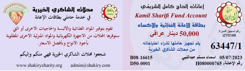 يقدم كادر الفرع والاسرة شكرهم وامتنانهم الى المتبرع الفاضل نسأل الله تعالى ان يرزقه خير الجزاء