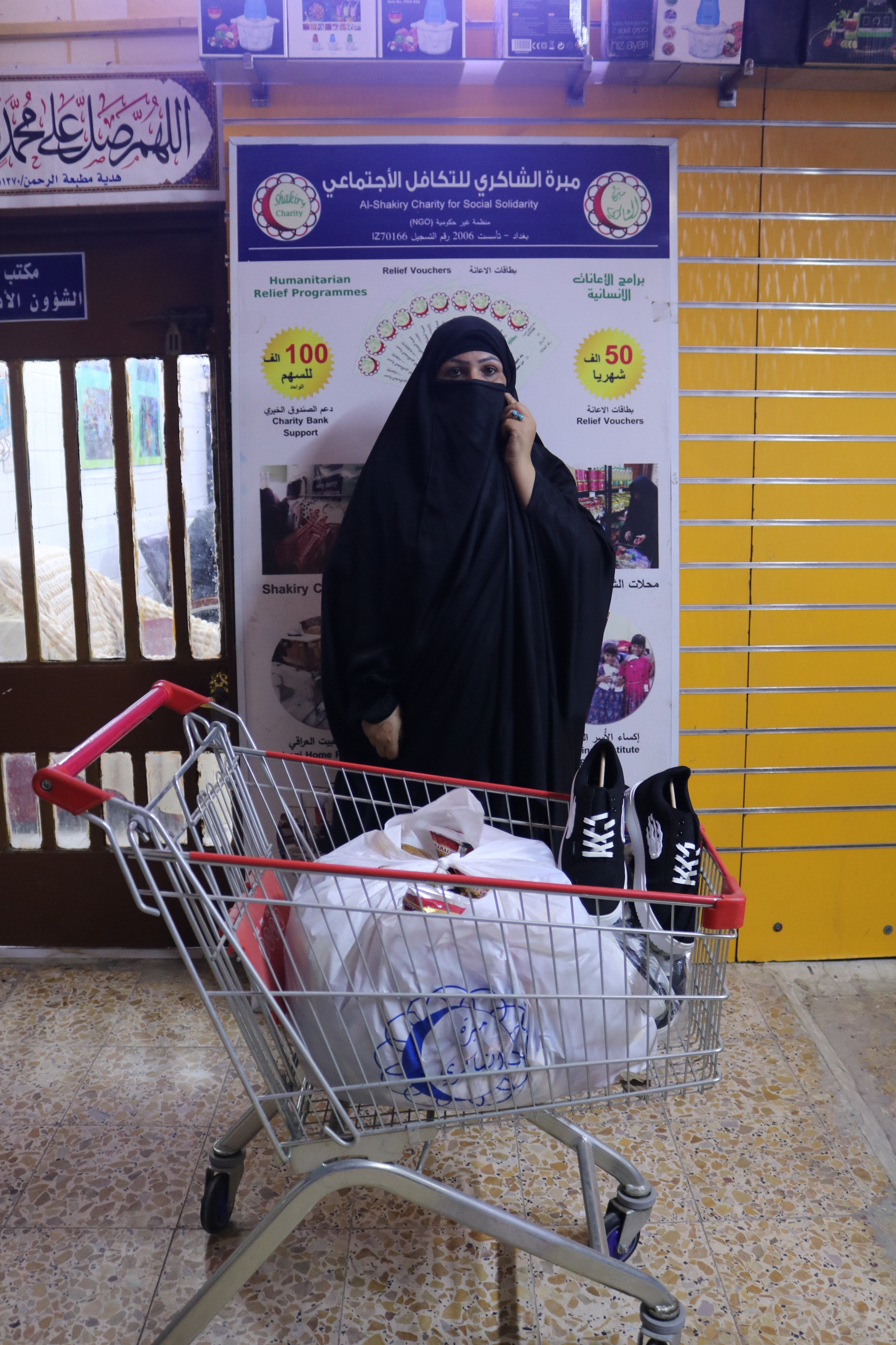 بعد الاستلام ابدت السيدة رغبتها بالحصول على / مواد غذائية حيث تم تجهيزها من محلات الشاكري الخيرية .