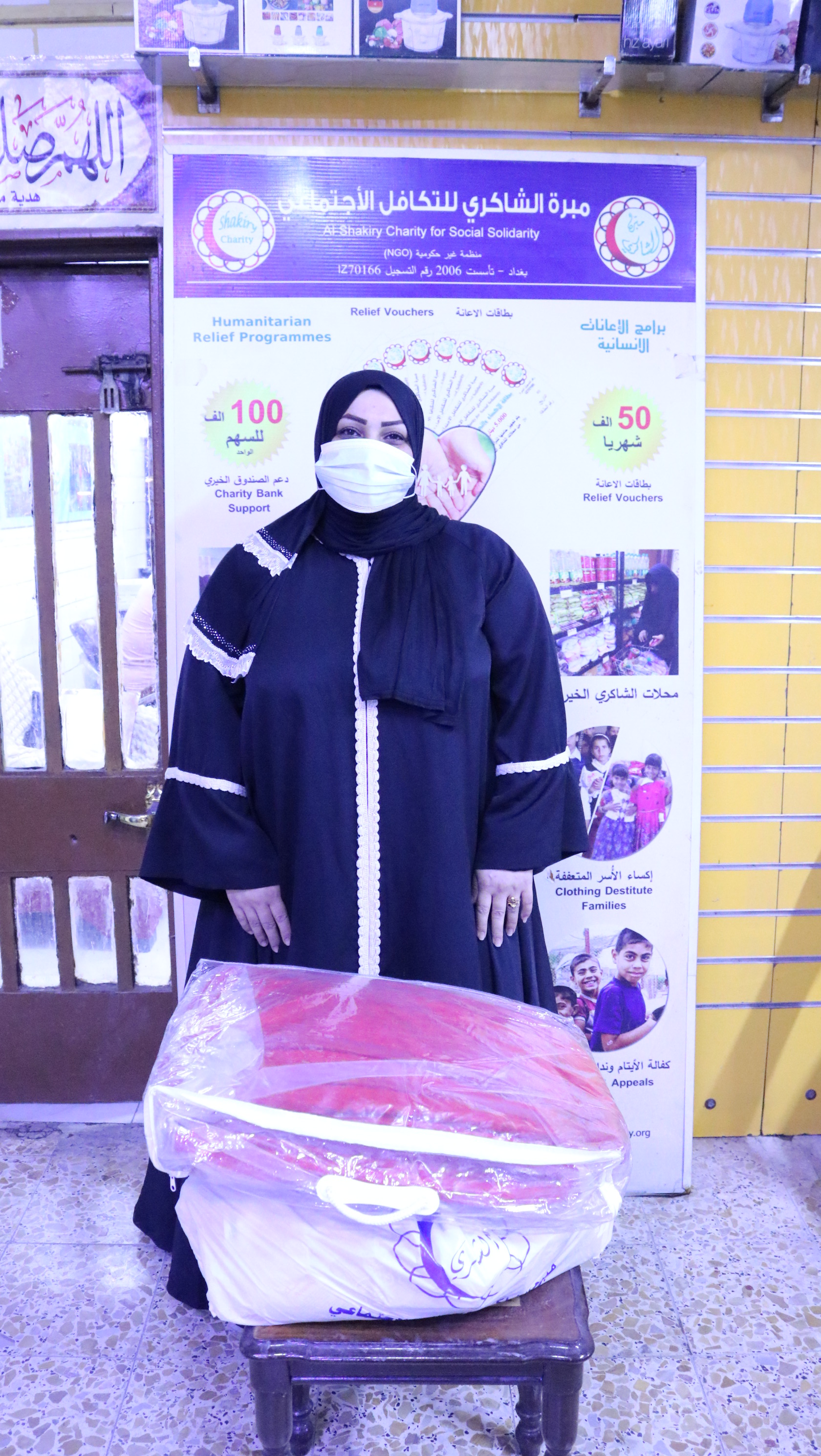 بعد الاستلام ارغبت المتعففه بأستلام ما ينسابها من / مواد غذائية وبطانيات وحيث تم تجهيزها من خلال محلات الشاكري الخيريه .