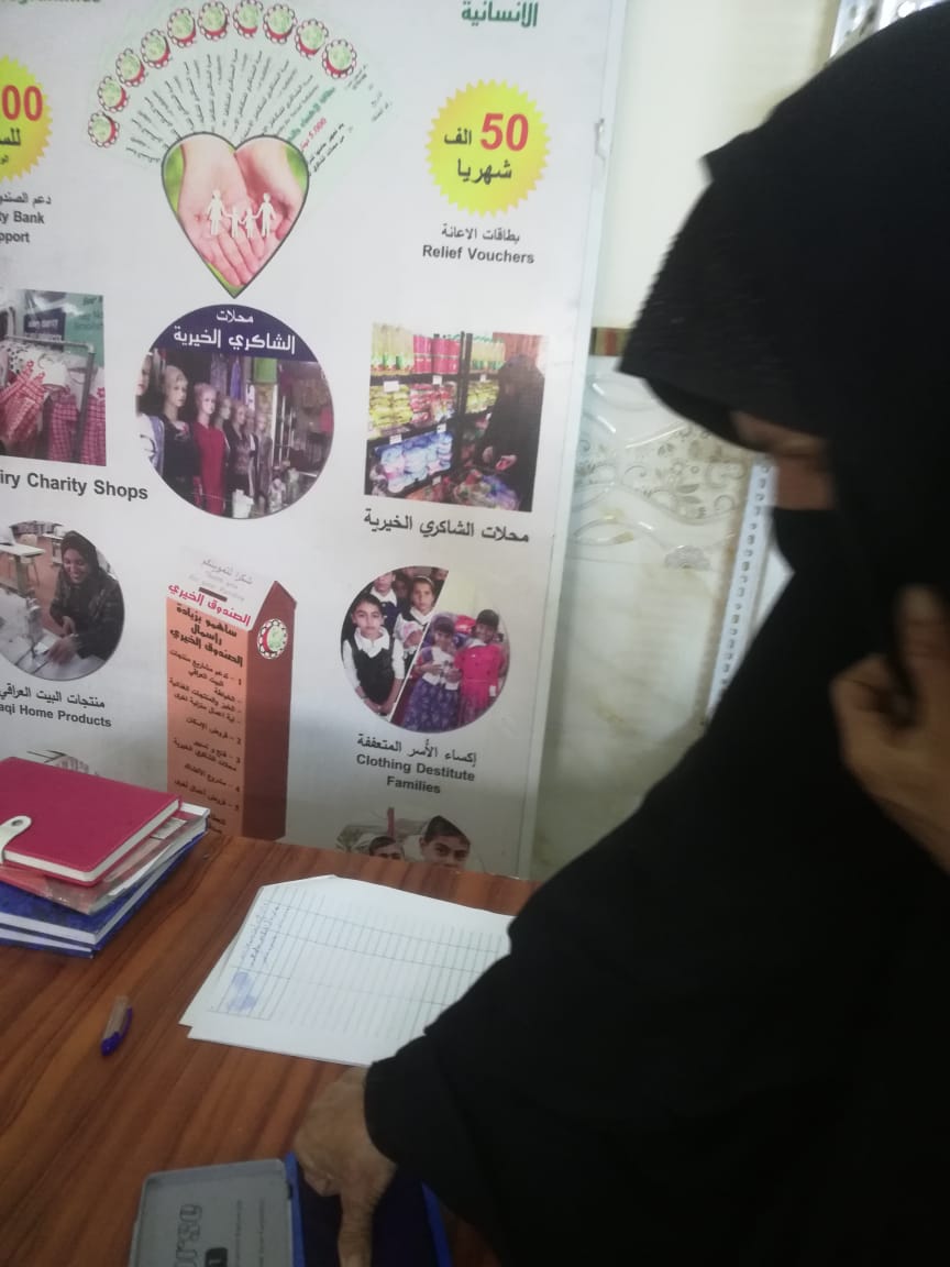 وفق بطاقات الغذاء والاكساء , وبعدها ابدت هذه الارملة رغبتها بالحصول على  ( سلة غذائية ) , وتم توفيرها لها