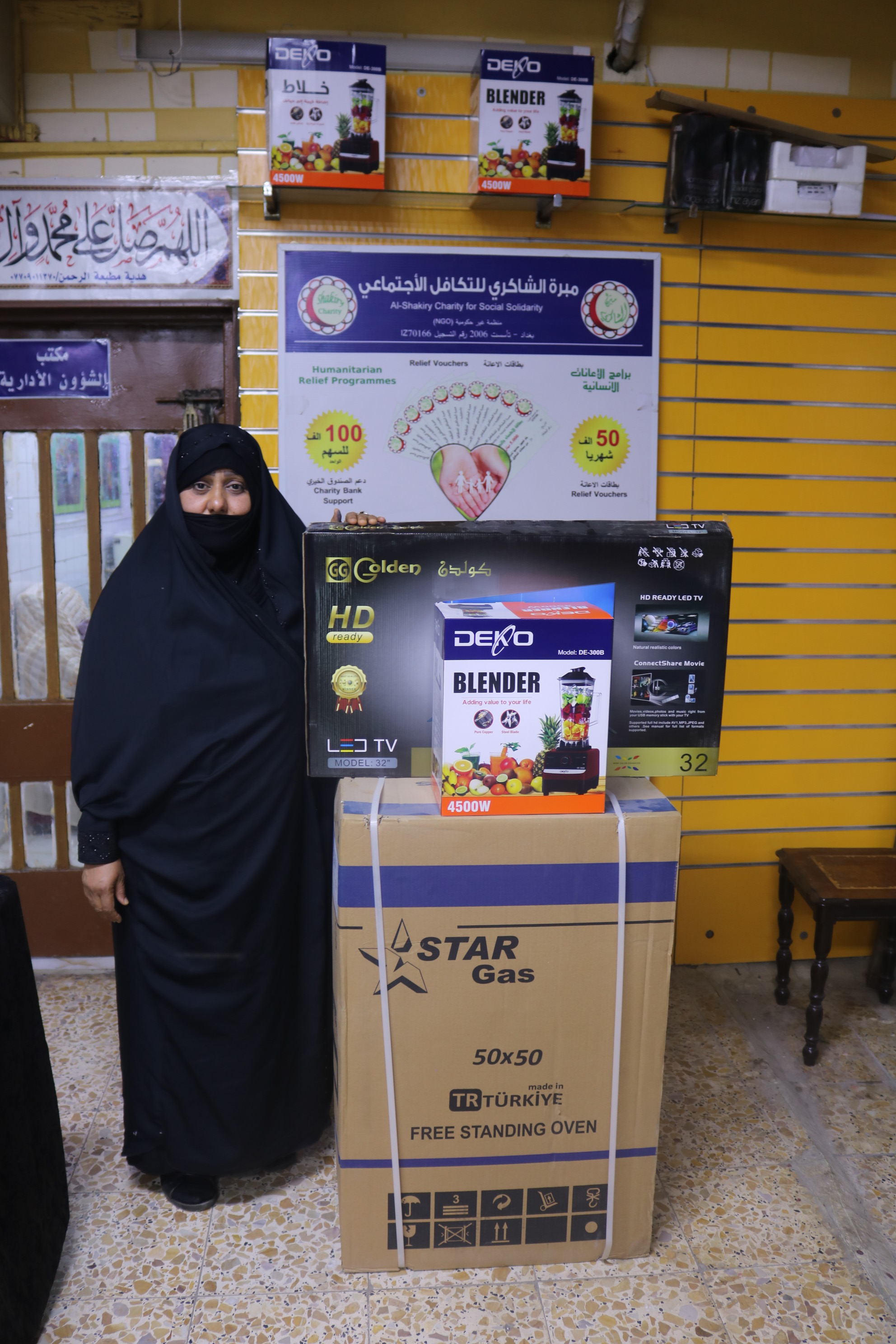 بعد الاستلام ارغبت المتعففه بأختيار ما يناسبها من/ طباخ وشاشه وخلاط حيث تم تجهيزها من محلات الشاكري الخيرية ويتم التسديد من خلال الكفالة الشهرية .