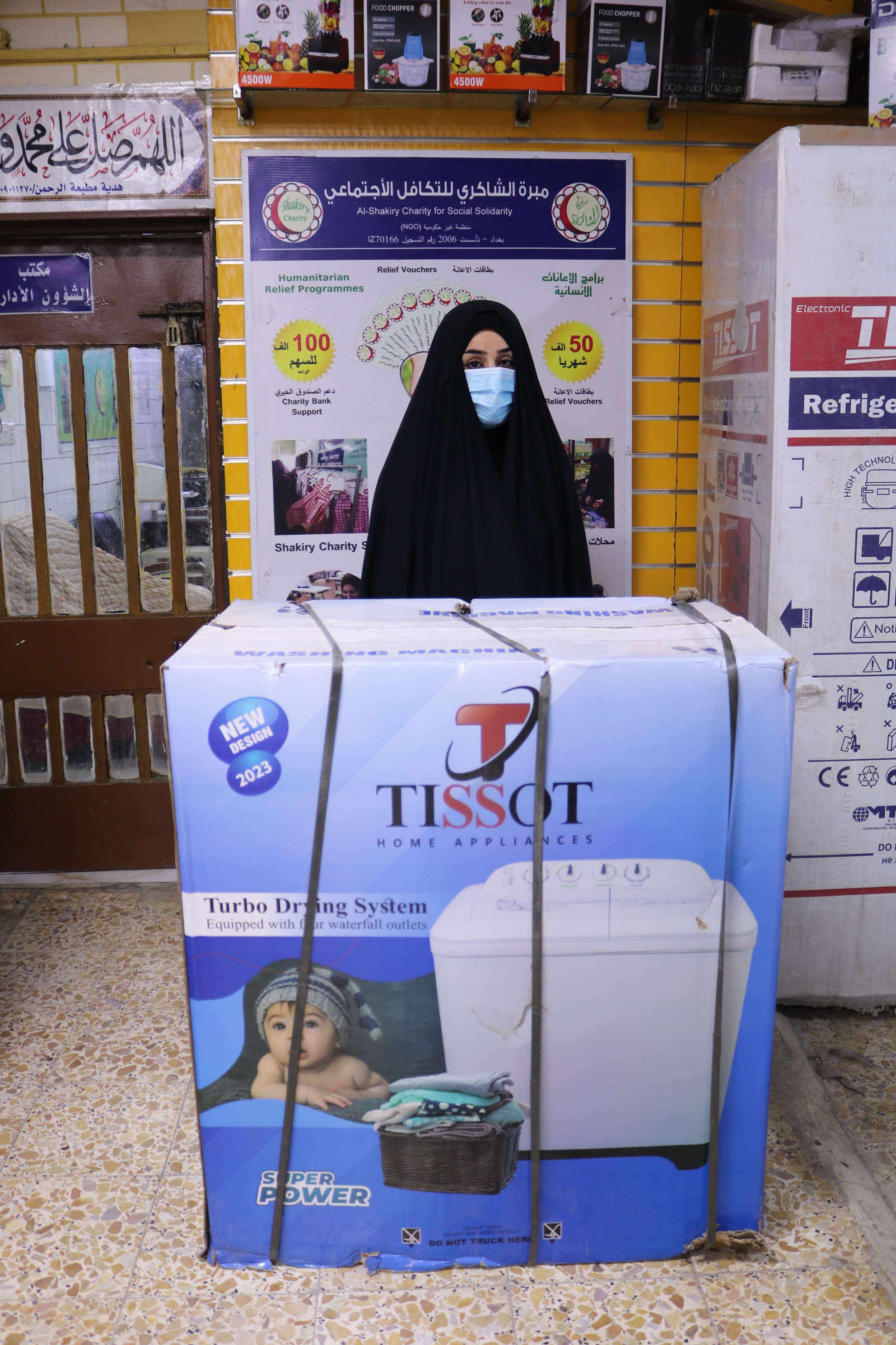بعد الاستلام ارغبت المتعففه بأختيار ما يناسبها من/ غسالة ومواد غذائية حيث تم تجهيزها من خلال محلات الشاكري الخيريه ويتم تسديدها من خلال الكفالة الشهرية .