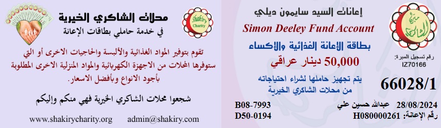 كادر الفرع قام بتسليم السيد المتعفف ( عبدالله . ح . ع ) بطاقة الغذاء والاكساء والمستلزمات الاخرى البالغ قيمتها (50)الف.د.ع مقدمة من قبل المتبرع المحترم/ سايمون ديلي .