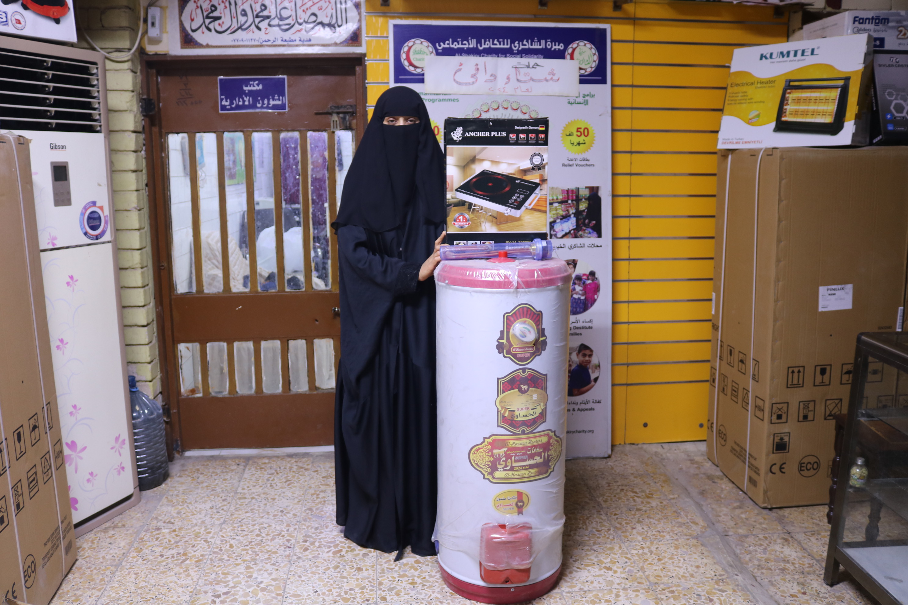 بعد استلامها ارغبت الارملة بأختيار ما يناسبها من / سخان ماء وطباخ ليزري وتم تجهيزها من محلات الشاكري الخيرية ويتم التسديدمن خلال الكفالة الشهريه للايتام
