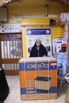 بعد استلامها ارغبت الارملة بأختيار ما يناسبها من / غسالة وتم تجهيزها من محلات الشاكري الخيريه ويتم تسديدها من خلال الكفالة الشهريه .