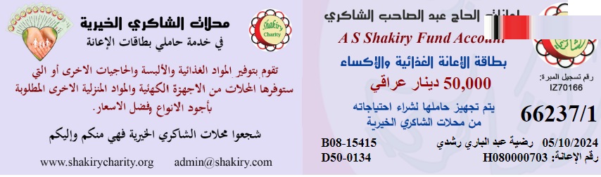 بعد الاستلام سددت الارملة القسط المتبقي في ذمتها الى محلات الشاكري الخيريه.