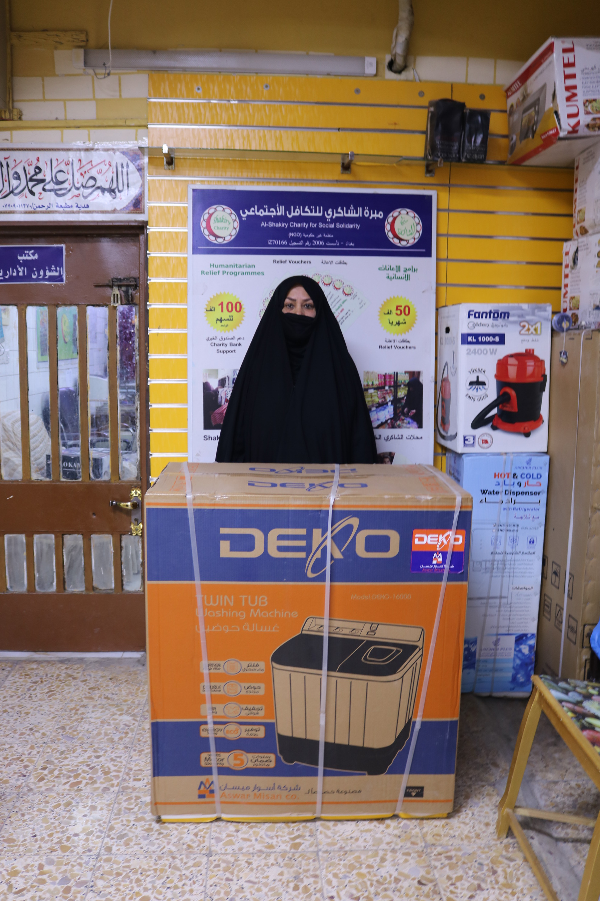 بعد الاستلام ارغبت الارملة بأختيار ما يناسبها من/ غسالة وتم تجهيزها من محلات الشاكري الخيريه.