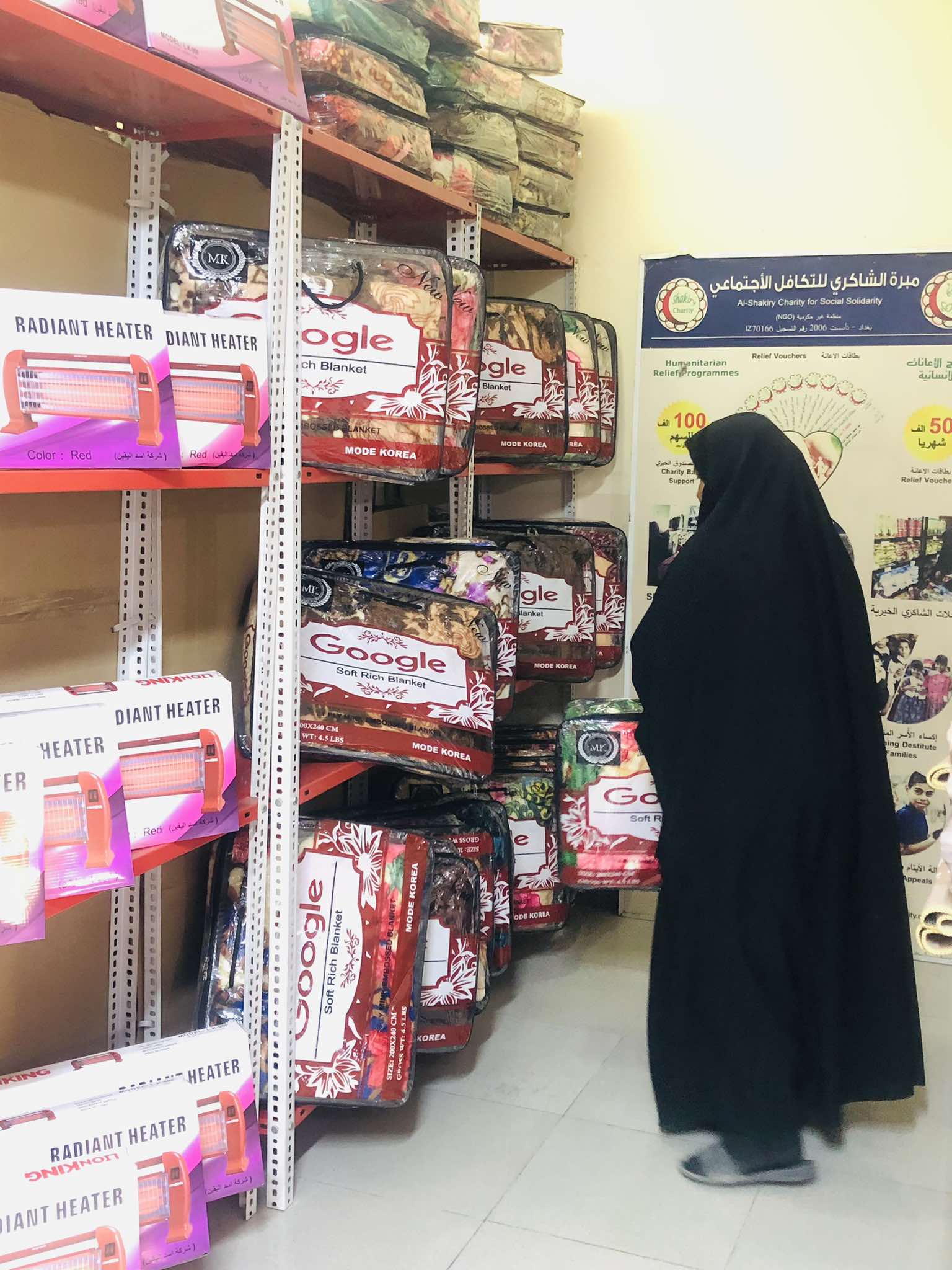 الارملة (احلام .ع .س ) وبناء على رغبة الاسرة تم تجهيزهم باأفرشة وأغطية ومدفئة كهربائية من محلات الشاكري الخيرية .