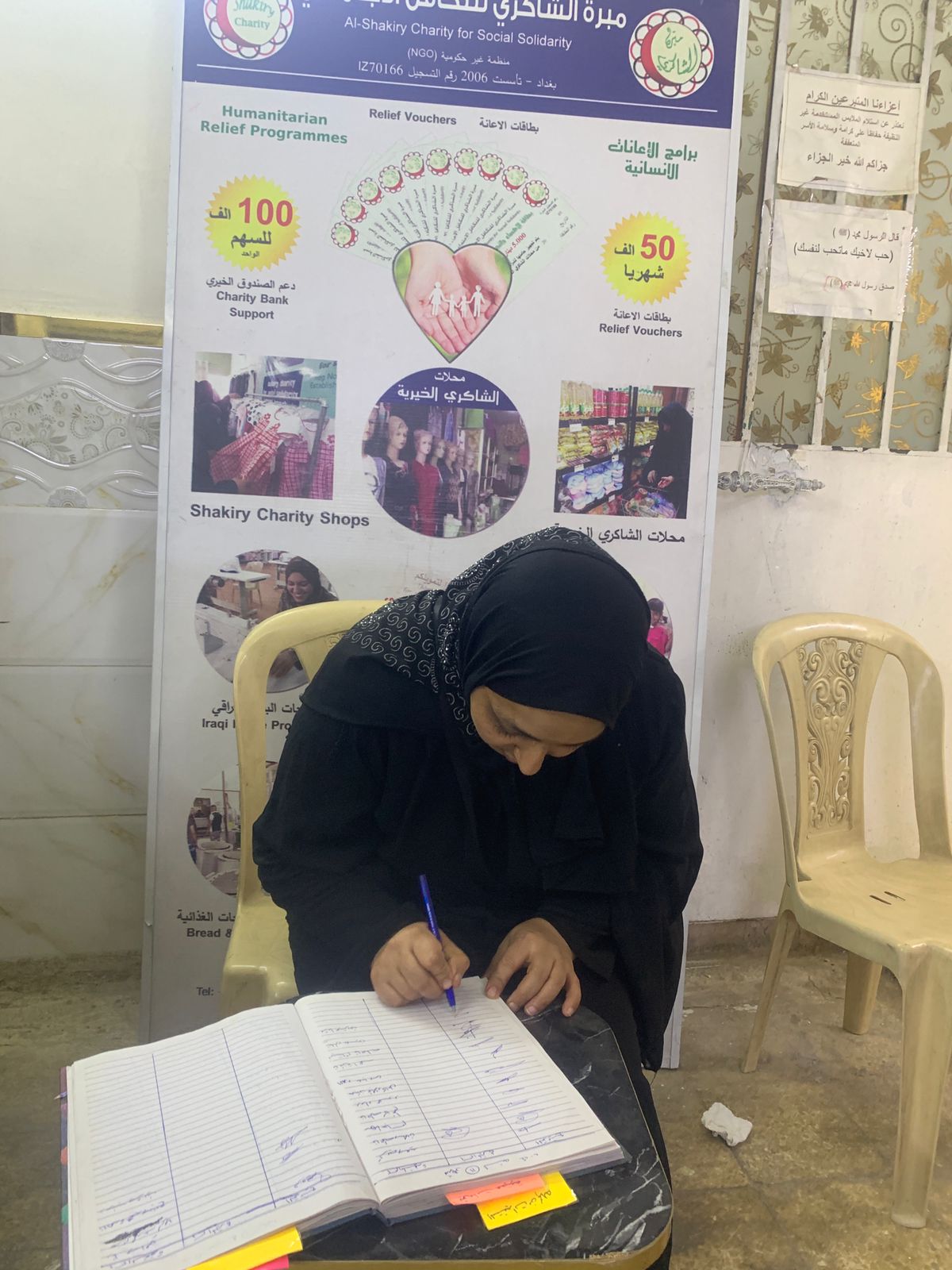 مساعدة مالية للارملة (ثريا , ش) من المتبرع / علي حسين الصفار,بقيمة (50) الف دينار عراقي وبعدها تم الاتصال بالاسرة وحضورها للفرع وتأمين احتياجاتها (مدفئه , زوليه,بطانيه ) يعد هذا العمل الانساني تفعيلاً لبرنامج توفير المستلزمات الضرورية للأسرة المتعففة عبر محلات الشاكري الخيرية .