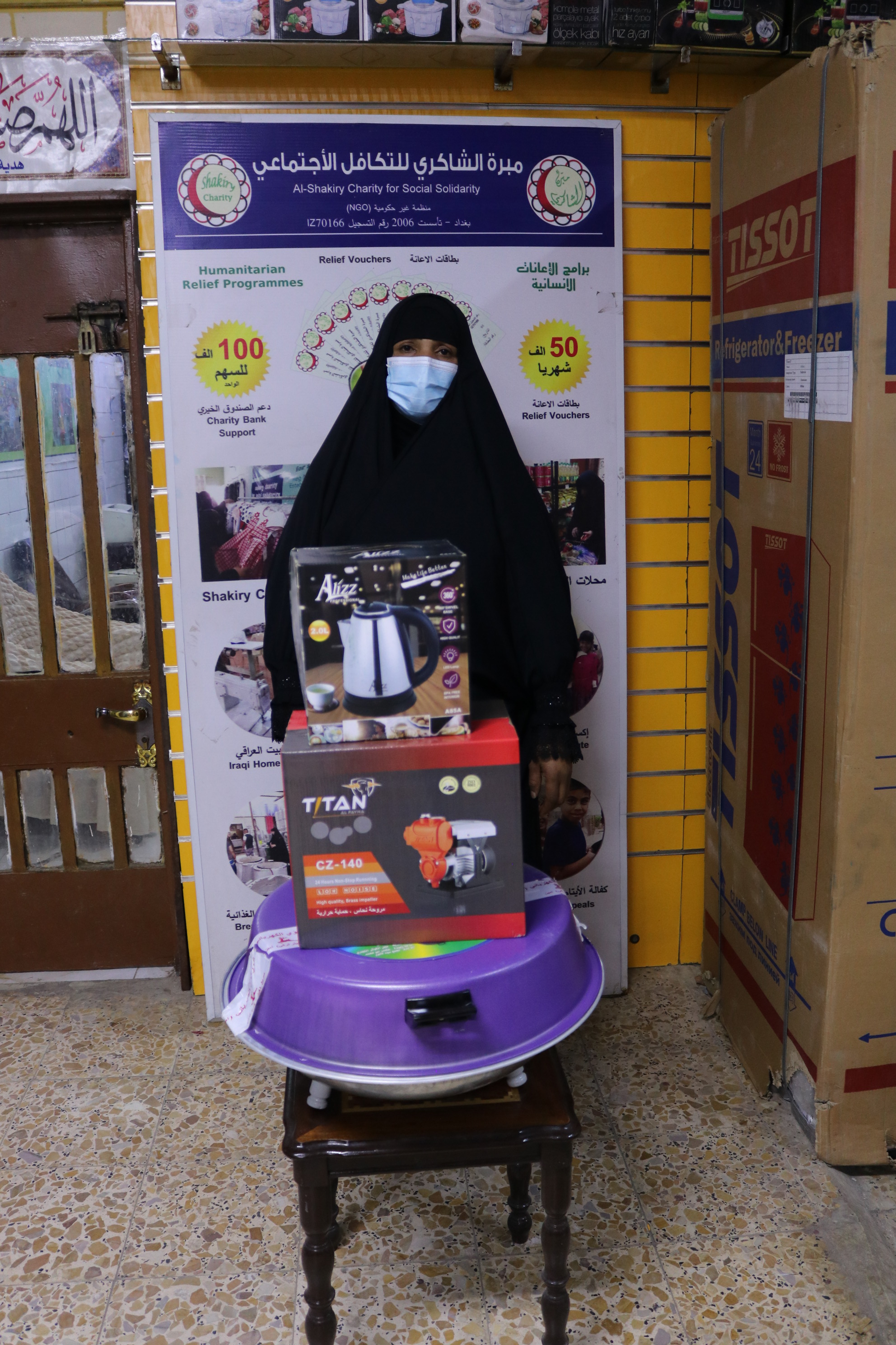 بعد الاستلام ارغبت الارملة بأختيار ملابس مدرسية ومكنسه كهربائية وتم تجهيزها من محلات الشاكري الخيريه