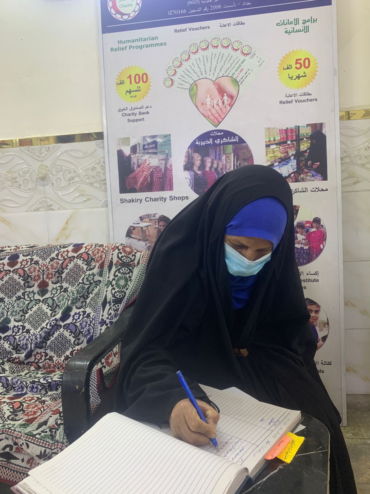 تسليم المساعدة المالية من المتبرعه الكريمه ( سالي الابراهيم) , للمتعففه (بشرى , ك) بقيمة (50) الف دينار عراقي ,وذلك وفق برنامج توفير المستلزمات الضروريه للاسر المتعففه لتلبية احتياجاتهم الضروريه (موكيت, بطانيا, مدفئه) وفق بطاقات الغذاء والاكساء المقدمة عبر محلات الشاكري الخيريه .