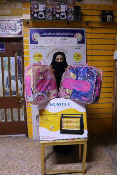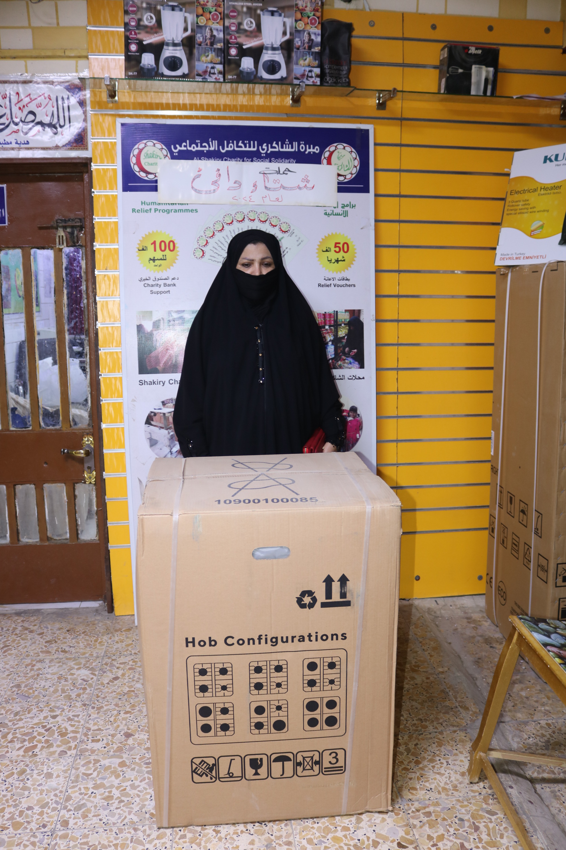 بعد الاستلام ارغبت المتعففه بأختيار ما يناسبها من/ هيتر كهربائي وبطانيات وطباخ حيث تم تجهيزها من محلات الشاكري الخيريه ويتم تسديدها من خلال الكفالة الشهريه .