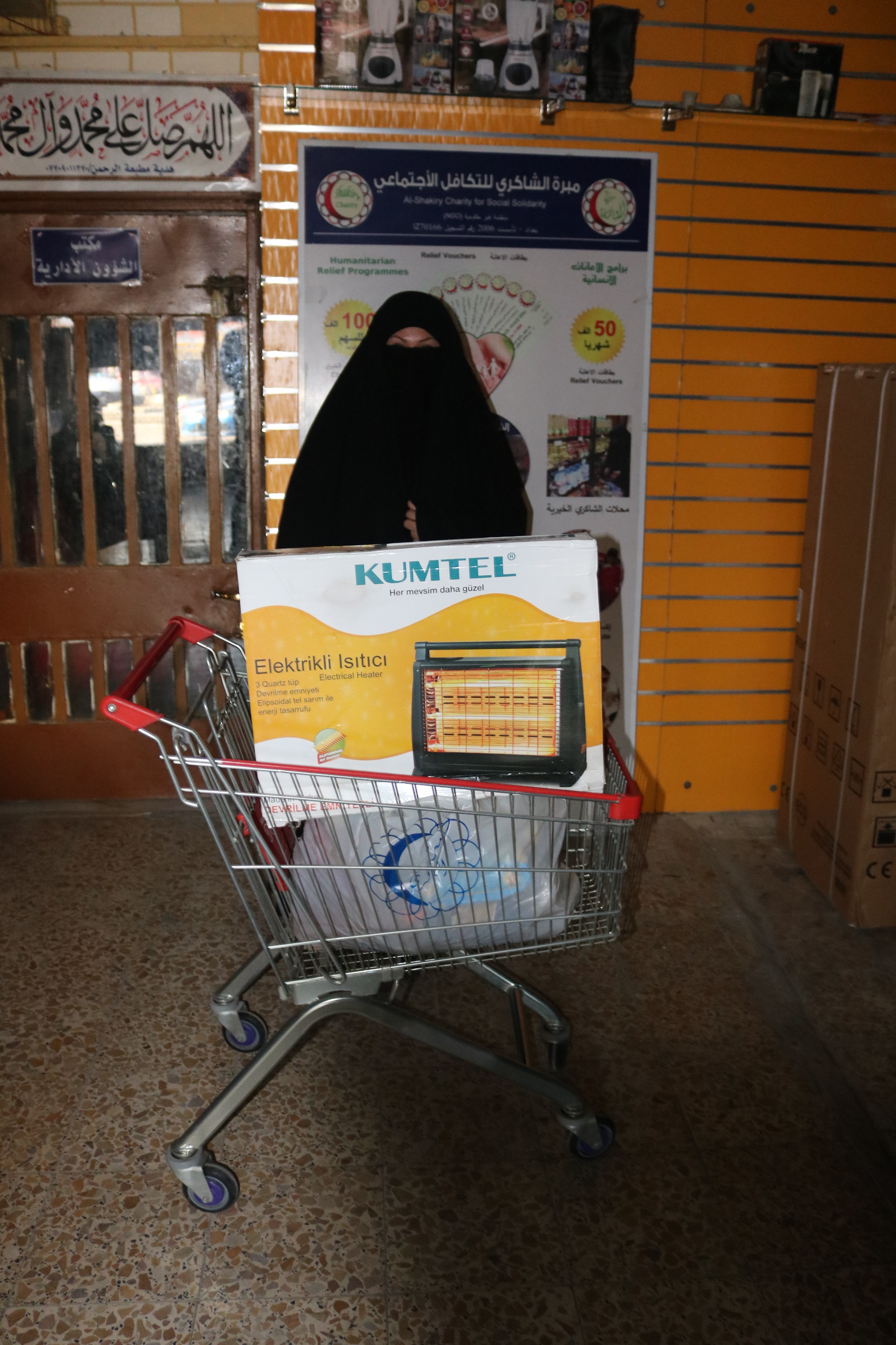 بعد استلامها ارغبت المتعففه بأختيار ما يناسبها من/مواد غذائية وهيتر كهربائي وتم تجهيزها من محلات الشاكري.