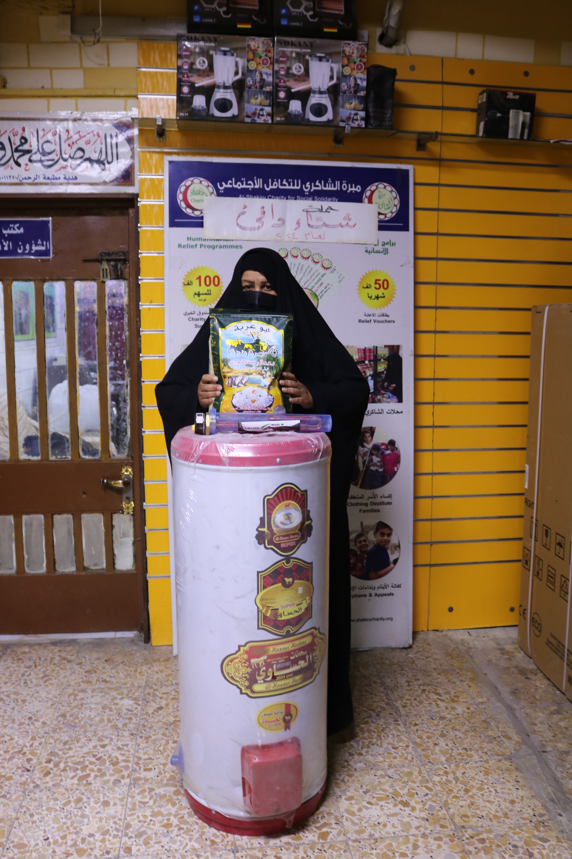 بعد الاستلام ارغبت المتعففه بأختيار ما يناسبها من/ سخان ماء وتم تجهيزها من محلات الشاكري.