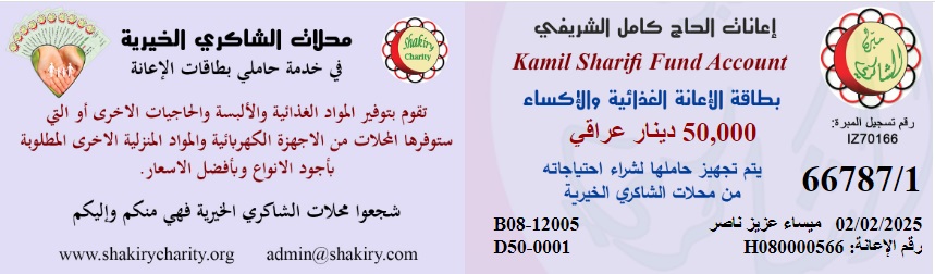 جزيل الشكر والامتنان الى المتبرع المحترم لعطائه الدائم المبارك نسأل الباري تعالى يجعلها في حسناته.