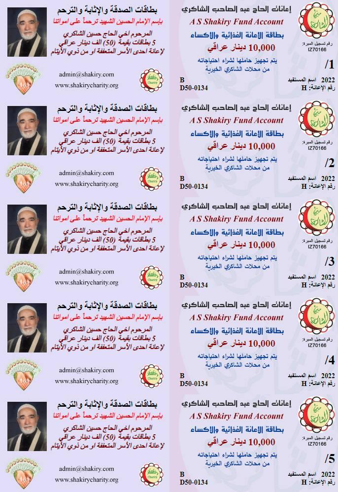 تسليم السيدة المتعففه ( حميده . ح . ص ) بطاقة الاثابة والترحم الى المرحوم الحاج/ حسين الشاكري(رحمه الله) والبالغ قيمتها (50) الف.د.ع مقدمة من قبل المتبرع الحاج/عبدالصاحب الشاكري
