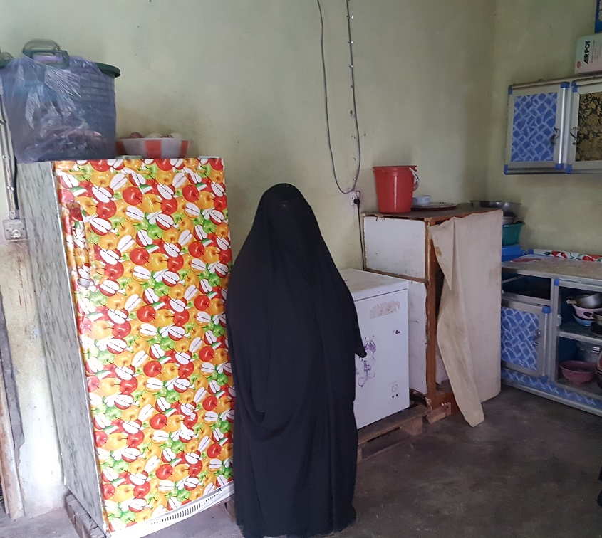 تسكن هذه اسرة السيده في بيت ايجار (150) الف دينار عراقي بسيط يفتقر الى العديد من المستلزمات المعيشة لكونها لا تستطيع شرائها بسبب العوز المادي , تستلم راتب تقاعد (450) الف دينار عراقي تقتسمها مع والده زوجها .