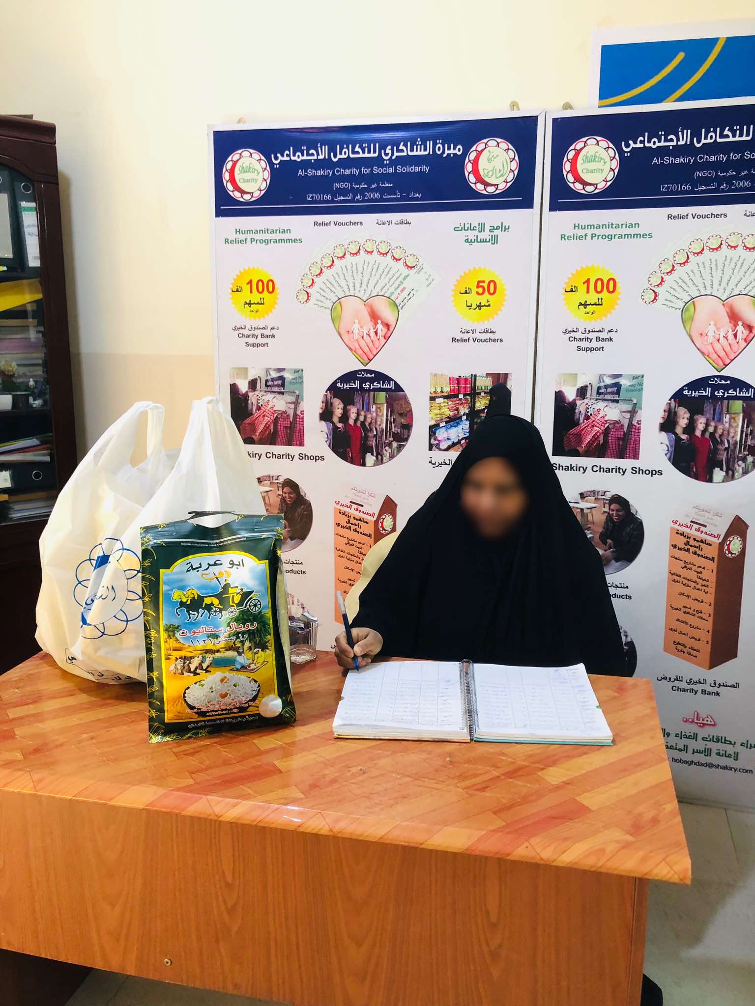(اناس، ف ،خ ) ، وبعد الاتصال وحضورهم تم تجهيزها بسلة غذائية من محلات الشاكري الخيرية .