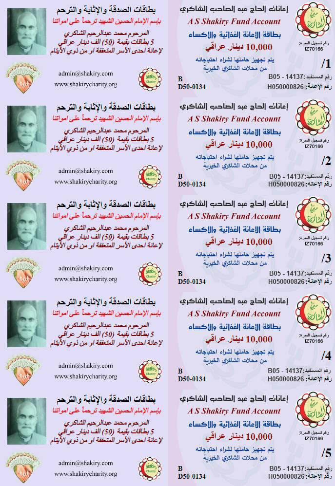 تبرع الحاج / عبد الصاحب الشاكري بمبلغ وقدره (50) الف دينار عراقي وذلك عن بطاقات الاثابه والترحم على روح المرحوم الحاج / محمد عبد الرحيم الشاكري لصالح السيده / ( حوراء . ع . ا ) وذلك عن توفير اهم احتياجات الاسره , و ابدت السيد رغبتها في الحصول على ( سله غذائيه رمضانيه ) وتم توفيرهاعن طريق محلات الشاكري .