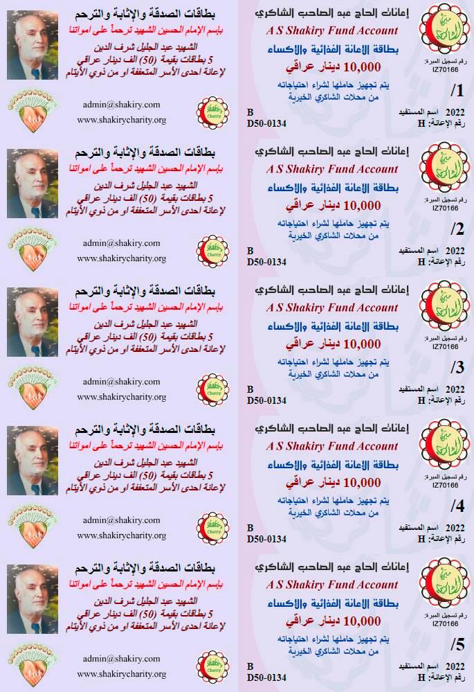 تسليم السيدة المتعففة ( انغام . ع . غ ) بطاقة الاثابه والترحم لروح المرحوم الشهيد عبد الجليل شرف الدين (رحمه الله) والبالغ قيمتها (50)الف.د.ع مقدمة من قبل / الحاج عبدالصاحب الشاكري