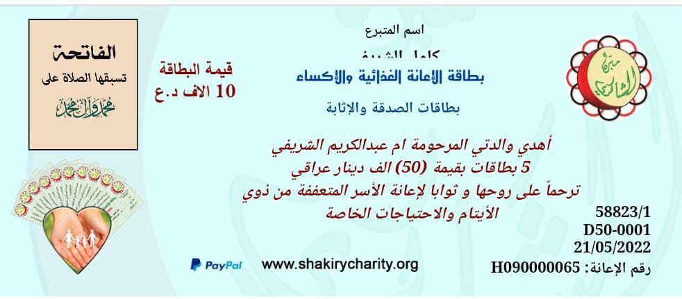 تسليم السيدة المتعففة ( ندوه . ن . ب ) بطاقة الاثابه والترحم لروح المرحومه ام عبدالكريم الشريفي (رحمها الله) والبالغ قيمتها (50)الف.د.ع مقدمة من قبل / الحاج . ك . ش