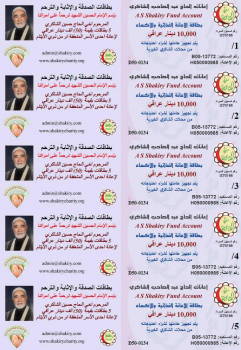 تبرع الحاج / عبد الصاحب الشاكري بمبلغ وقدره (50) الف دينار عراقي وذلك عن بطاقات الاثابه والترحم على روح المرحوم الحاج / حسين الشاكري لصالح الارمله / ( شفاء . ح . ل ) وذلك عن توفير اهم احتياجاتها , وابدت السيده رغبتها في الحصول على ( مواد منزليه ) تم توفيرها عن طريق محلات الشاكري الخيريه .