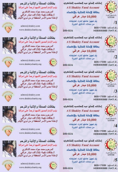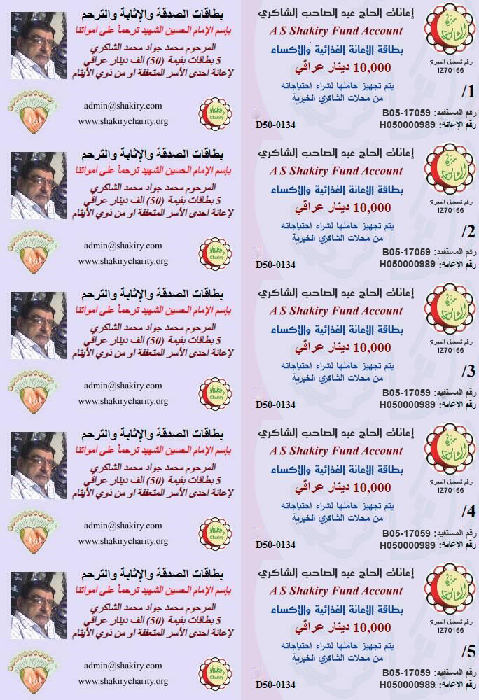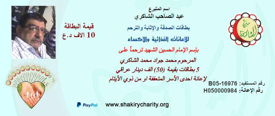قام كادرنا بتسليم أسرة المتعففة / (منال . ع . ا ) بطاقات الاثابه والترحم على روح المرحوم / محمد جواد محمد الشاكري والبالغ قدرها (50) الف دينار عراقي لأعانة اسرتها وابدت السيده رغبتها في شراء ( مواد منزليه ) تم توفيره للمستفيده عن طريق محلات الشاكري الخيرية .