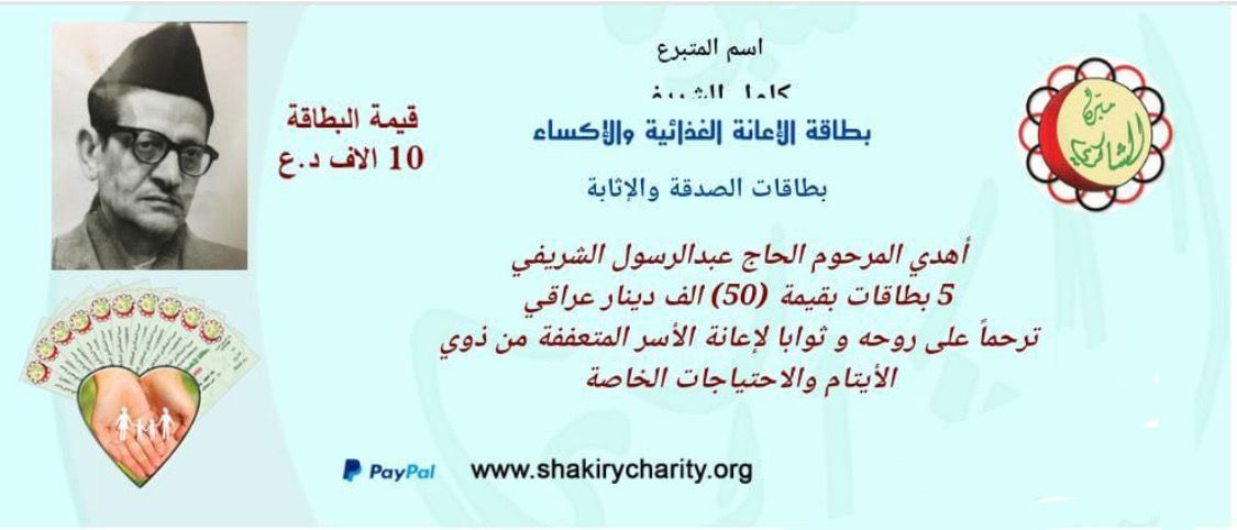 مساعدة مالية للمتعفف ( هلال ,ك) من السيد / ك ش ,بقيمة (50) الف دينار عراقي عن قيمة (5) بطاقات للصدقة والاثابة والترحم ثواباً وترحماً على المرحوم/ الحاج عبد الرسول الشريفي بعدها تم الاتصال بالاسروحضورالزوجه للفرع وتامين (سله غذائية ) , يعد هذا العمل الانساني تفعيلاً لبرنامج توفير المستلزمات الضرورية للأسرة المتعففة عبر محلات الشاكري الخيرية