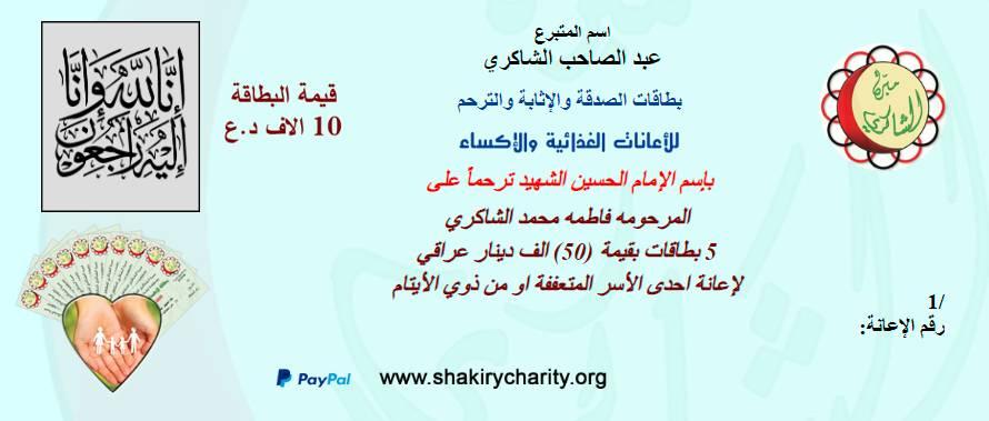 تم تسليم المساعدة المالية للمتعففه (بتول ,خ) من الحاج / عبد الصاحب الشاكري والبالغ مقدارها (50) الف دينار عراقي عن قيمة (5)بطاقات للصدقة والاثابة والترحم ثواباً وترحماً على المرحومه / فاطمه محمد الشاكري حيث تم الاتصال بها لأستلام ( سلة غذائية ) رغبت من كادر العمل لتأمينها اليها .