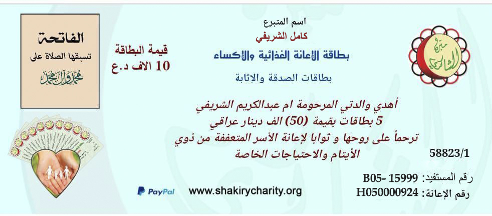 تم تسليم التبرع من الاستاذ / ك . ا عن بطاقات الاثابه والترحم على روح المرحومه / ام عبد الكريم الشريفي بمبلغ وقدره (50) الف دينار عراقي الى السيده / ( حوراء . ط . ع ) , و ذلك عن توفير اهم احتياجاتها , وابدت السيده رغبتها في شراء ( مواد منزليه ) وتم توفيره عن طريق محلات الشاكري الخيريه .