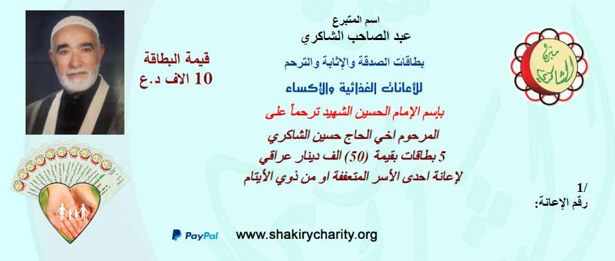 تم تسليم المتعففة ( دنيا ، ك ، ش ) التبرع والذي يبلغ (50) الف دينار عراقي قيمة خمسة بطاقات للاثابة والترحم مهداة الى روح المرحوم الحاج حسين الشاكري مقدم من الاستاذ / عبدالصاحب الشاكري. وبعد الاتصال بها وحضورها لمقر الفرع تم تسليمها مبلغ التبرع لتوفير احتياجاتها الضرورية .