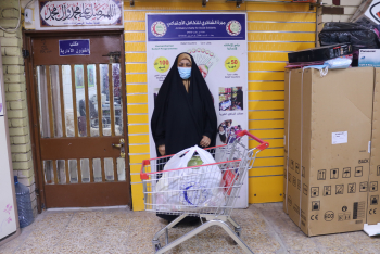تسليم السيدة المتعففه ( حميدة . ج . ص ) بطاقة الغذاء والاكساء والمستلزمات الاخرى البالغ قيمتها (50)الف.د.ع مقدم من قبل المتبرع الحاج / ك . ش .